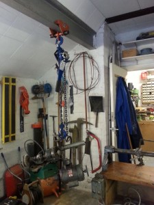 Next I discovered I can't lift the motor assembly, so I broke out and used the engine hoist Dad bought me for Christmas 1988 when I had a motorbike with a seized engine, and never used. Using some welded-link chain and a screw karabiner, I rigged a sling, and hauled the motor up, rolled the lathe underneath, lowered it down, clunk - into place.