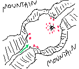 Heading carefully up the pass, the group began to find tracks, indicating around a score of light-footed, but armoured, individuals, well-versed in wilderness lore, had passed up the valley no more than a week ago. All paused to bring up defensive magics, and Sack went Invisible and moved ahed to scout. Around half a mile further on, he found a place where the narrow pass suddenly opened out into a wide, steep-sided depression, before carrying on again through the mountains. Carefully, Sack inched himself to where he could see into the dell.