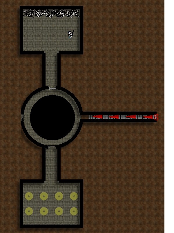After fifty feet or so, the stairs opened into a huge, circular hall, forty feet across, and with a 5' rail-less walkway around it. A domed ceiling soared into dimness thirty feet above, and the pit in the centre dropped away into the darkness. The released water from Nuchar's Tomb above was pouring across the walkway and into the pit, and as the party reached the bottom of the stairs it dawned on them that the current and the slimy stairs were going to make it rather hard to stop...