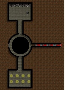 They had already noticed that there were three doors leading off the circular pit room, and choosing one at random they opened it and went in. A long corridor opened into a square room, thirty by fifty. It appeared empty, except for a bewildering array of green bronze and rusty steel levers, arms cams and cogs attached to the stone ceiling, ranged around a regular pattern of eight 3’ metal disks attached at regular intervals. A single door at the far side appeared heavily bolted.