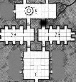 Gorfang reached the top of the stairs and peered around, finding (although he didn't know it) a similar arrangement in reverse [7b]. Unlike Lynien and Gorfang, he could easily read the writings around the walls, which declared that this was the last resting place of the High Priestess Osoketa, extolling her virtues, her holiness, and the number of sacrifices she had offered to Shushkrah in her life. A silver blazon with Shushkrah's emblem decorated the back wall.