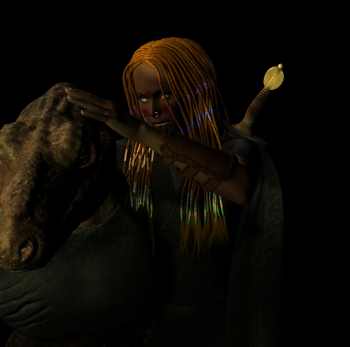 feeling was severely put to the test, however, when the adventurers started making plans to destroy the crystal pyramid - the Deathbreaker as they now knew it to be. "My friends," he said carefully, "I owe my life and my tribe to your help, and I know we can't possibly oppose you; but I do not want you to destroy the Crystal of the Gods. Our tribe's health and strength have come from it for generations, and without it the Gods will turn from us!" Méabh put a reassuring arm around his shoulders. "Don't you worry about a thing," she said hypnotically, as the spell Touch of Idiocy took hold of the unfortunate lizardman, "everything's going to be all right." Looking confused, Berretlan wandered away. Méabh chuckled darkly to herself.