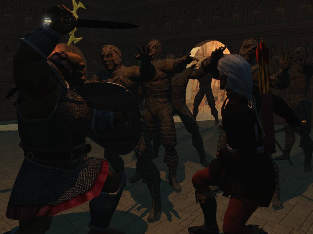 The two warriors had sensibly remained in the archway, limiting the number of attackers that could face them at once. As the mummies closed, one pointed at Gorfang and rasped "The crown must be returned!". Eloy, thinking to negotiate, responded in Selasht; "We intend to!" Gorfang glanced sharply at him; the first he'd heard of such a plan. However, the mummy's reaction to Eloy put the cappers on that anyway. "Begone, Corrupted One," it ground out, and the undead kept coming.
