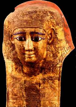 Lynien, despite Eloy's expressions of concern, shoved the lid of one of the coffins open. Inside was a body, enwrapped in thick bandages and with a heavy death-mask over its face. This latter had some gold inlay on it, and Lynien gleefully began to pry this loose. As the first bit came free, the mummy shockingly moved. Lynien sprang back as it sat up, turned its head and regarded her.