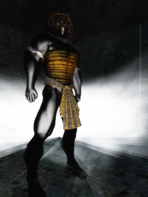 actors in the little scene of mistaken death all stood as if paralysed. The spray of vital fluids and bone fragments was frozen in an arc surrounding the gory bronze blade as it stood deep in Eloy's skull. His physical body remained still; but his soul blinked and looked around. For an instant he wondered if this was the afterlife, and then a familiar figure materialized slowly. The massive, muscular body; the jackal-head; the Khabran costume; the ink-black flesh and glowing red eyes. Eloy looked upon salvation and damnnation as one and the same.