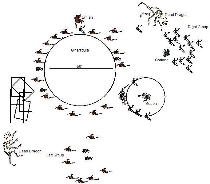 The three soldiers charging Gorfang reached him and died almost instantly. Shaking the blood from his blades he charged towards the g'narf'dula where the remaining lizards were gathering for a concentrated attack.