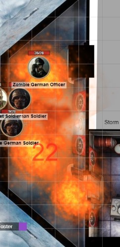 He dashed back through the weather door and out to the blockhouse. Peering through the vision slits, he saw a confused jumble of bloody, frozen shapes in a variety of shreds of clothing - white coats, Soviet green, Heer grey. Faint moans rose from the figures as they lumbered around, battering at the door with utter disdain for the damage their limbs suffered in the process. Birapeer unpinned a grenade and pushed it - after a bit of trouble getting it past the frozen machinegun - through the gunport. The explosion was followed by a distinct reduction in the assault, but it slowly resumed, presumably as more undead shambled forward.