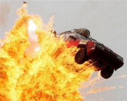At the other side of the car park was Dexter's speeder with its' security markings. Alice lifted her rifle. "Don't want him getting away," she commented, and fired a RAM at it. The HEAP round smashed almost all the way through the car's thin metal before it exploded, blasting the car to bits in a boiling fireball; very spectacular, very satisfying, very noisy.